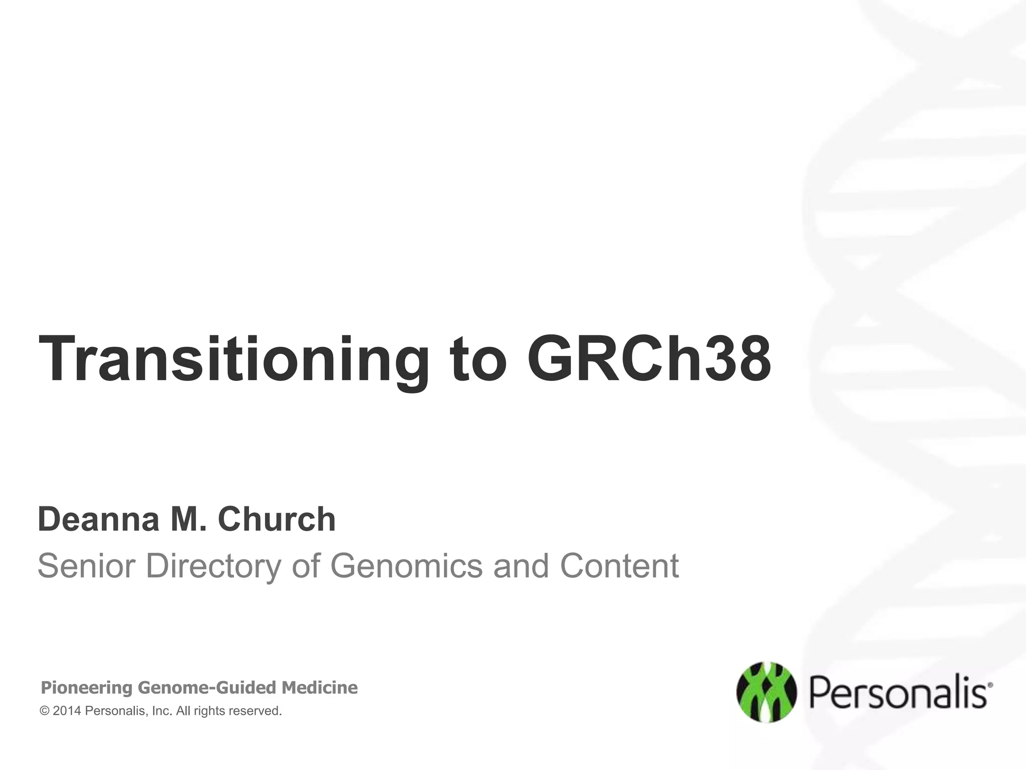 Personalis is transitioning to using the GRCh38 human reference genome. This new version includes 3.6 Mb of novel sequence and 153 genes not present in the previous assembly. Analysis of variants is more challenging with the new assembly due to additional paralogous and allelic duplications as well as alternate loci. New computational tools are needed to properly align sequences and call variants in these complex genomic regions.