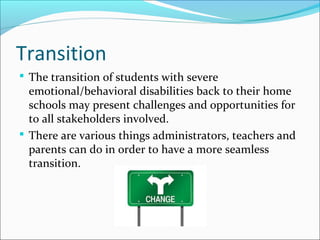 This document discusses strategies for supporting students with emotional and behavioral disabilities as they transition from an alternative school placement back to their home schools. It provides background on common characteristics and perceptions of these students. It also outlines four major categories of support: social skills instruction, classroom management techniques, cooperative learning, and promoting positive self-image. Specific strategies are proposed under each category, such as explicitly teaching social skills, using individualized reward systems, assigning student roles in cooperative groups, and providing more praise to boost self-esteem. The goal is to help these students successfully transition back to their home schools.