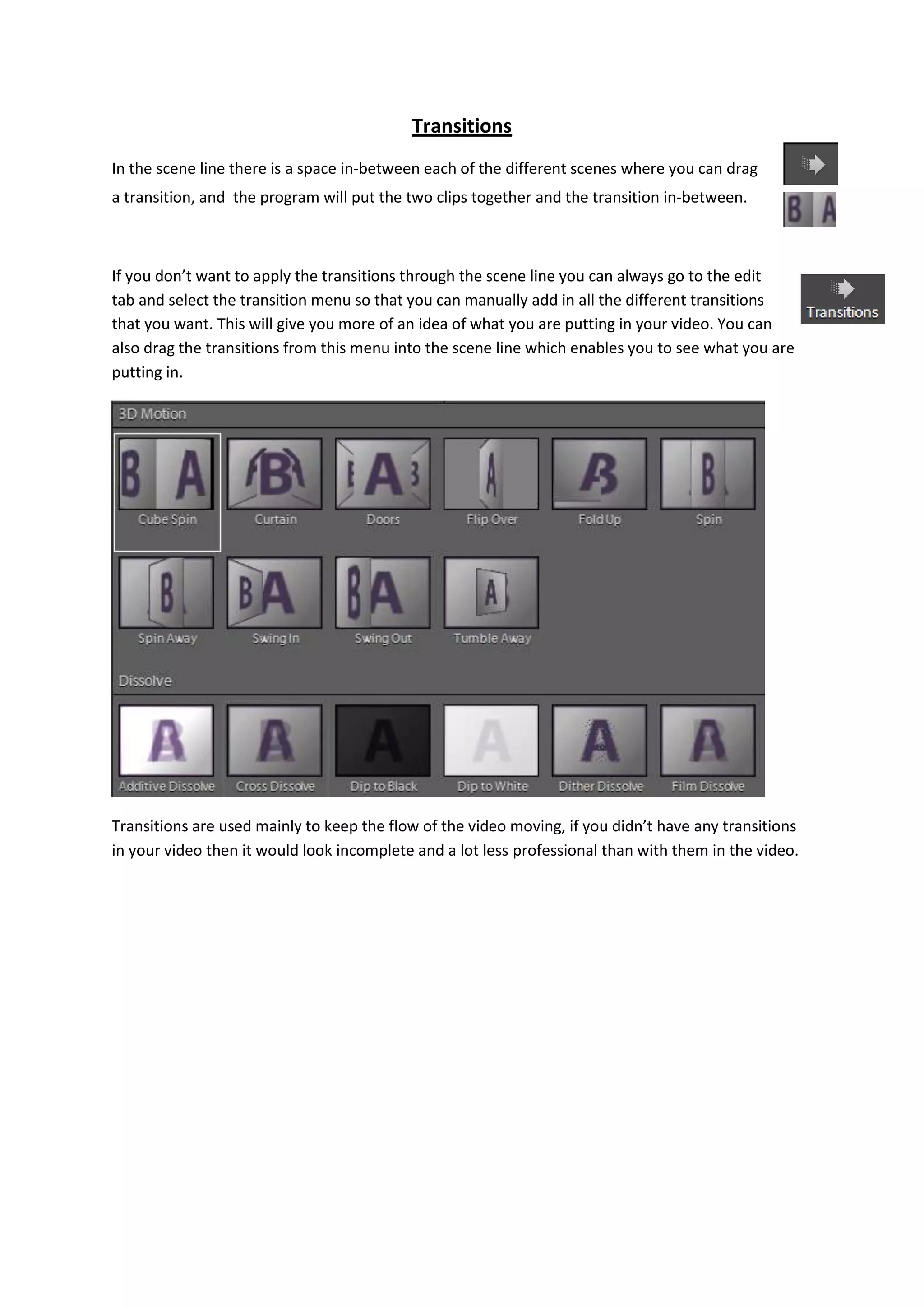 Transitions can be added between video clips in the scene line by dragging a transition into the space between clips. Alternatively, transitions can be manually added in the edit tab by selecting from the transition menu. Transitions help keep the video's flow moving and make it look more professional than a video without transitions.