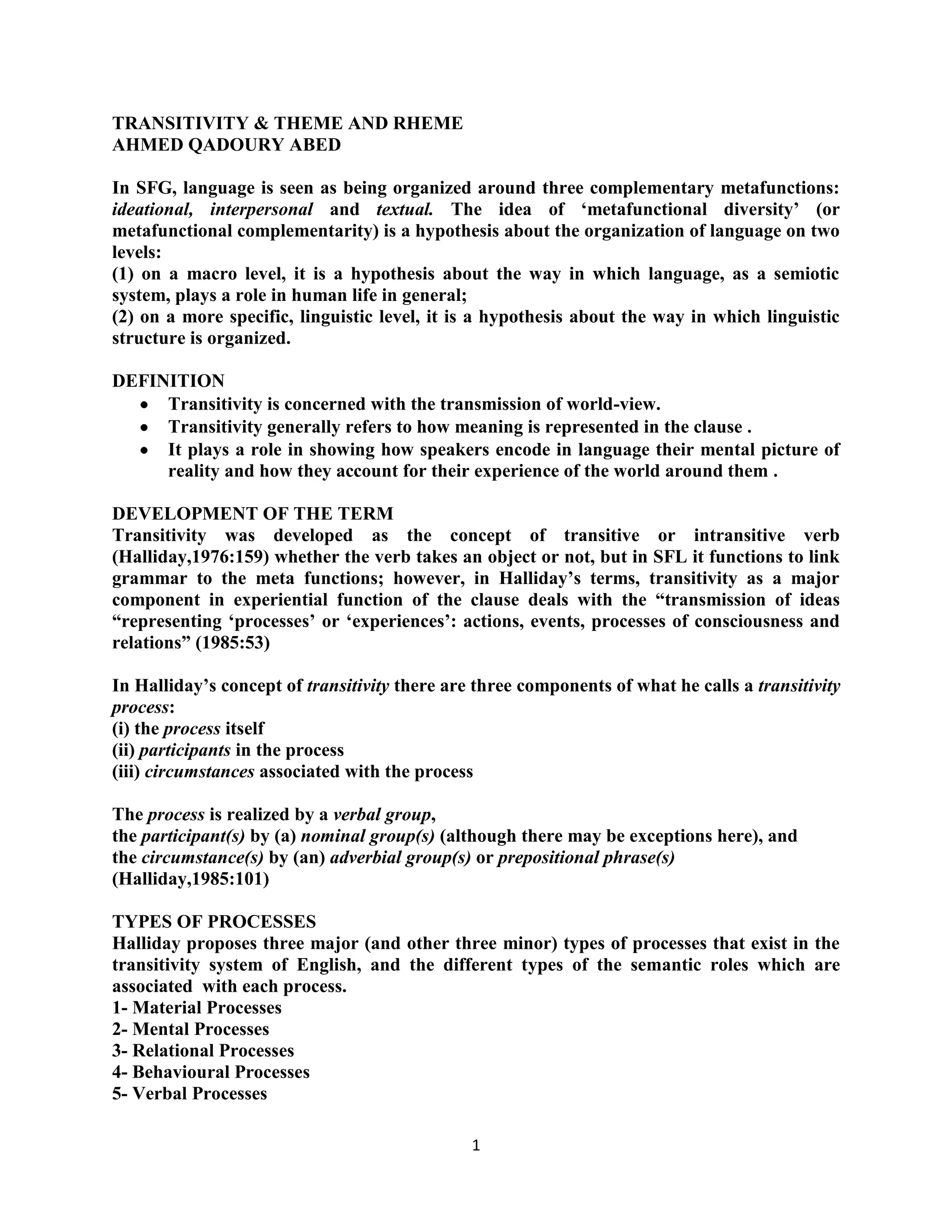 This document provides an overview of transitivity and theme/rheme analysis in systemic functional grammar. It defines transitivity as how meaning is represented in clauses and how speakers encode their view of reality. It describes the key components of transitivity processes - processes, participants, and circumstances. It outlines six major process types: material, mental, relational, behavioral, verbal, and existential. For each process type, it defines the participants and provides examples. The document also analyzes the participants and process types used in different parts of the short story "Heroic Mother".