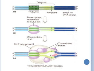 Dokumen ini menjelaskan proses transkripsi RNA dari DNA, termasuk tahap inisiasi, elongasi, dan terminasi. Transkripsi melibatkan enzim RNA polimerase dan menghasilkan tiga jenis molekul RNA: mRNA, tRNA, dan rRNA, dengan mekanisme yang berbeda antara prokariot dan eukariot. Selain itu, ada faktor-faktor transkripsi yang memandu RNA polimerase dalam proses ini.