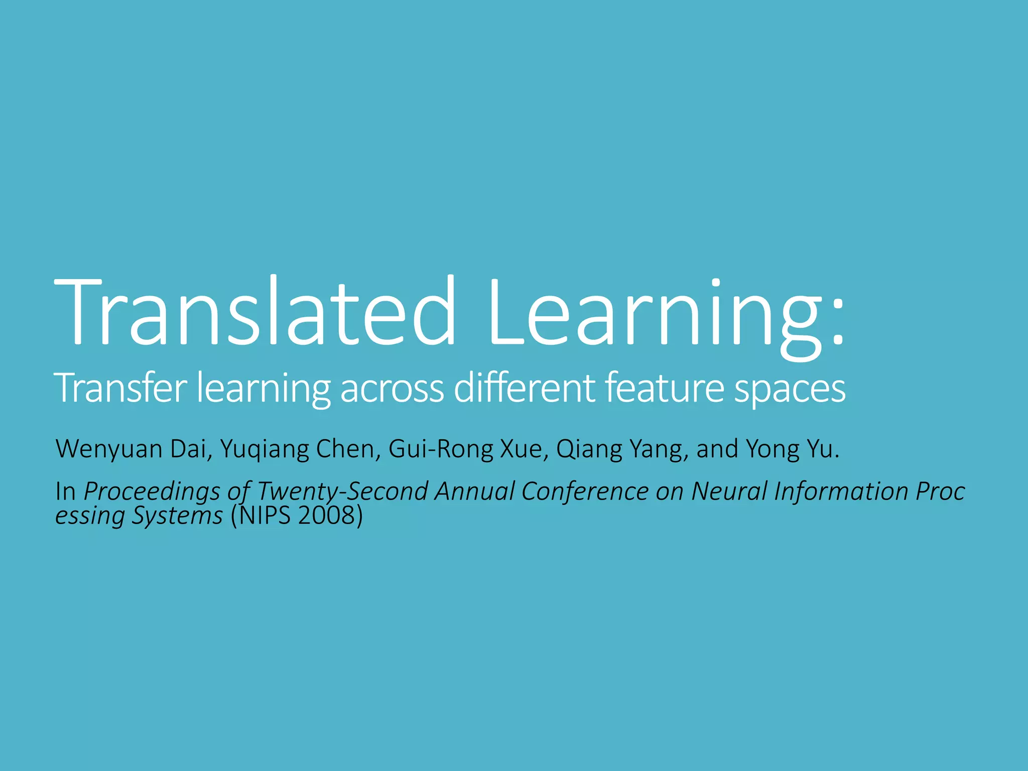This document presents an approach called translated learning that allows for transfer learning across different feature spaces. It describes how translated learning works by using a feature translator to link labels from a source feature space to the target feature space using only a small amount of labeled data in the target space. The approach is formulated as a risk minimization framework and models are estimated via an approximation method. The effectiveness is demonstrated on two applications: text-aided image classification and cross-language classification, showing improved performance over not using the translated learning approach, especially when labeled data is limited in the target space.