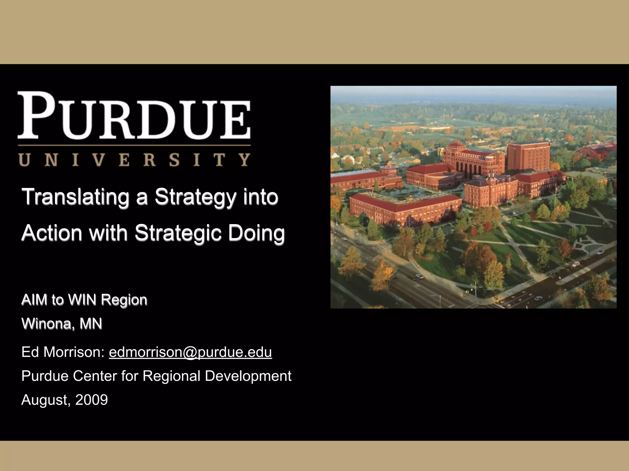 The document outlines a workshop held on August 26, 2009, in Winona, MN, aimed at helping regional leaders translate their strategic documents into actionable plans. It emphasizes the concept of 'strategic doing,' which encourages collaboration and innovation through rapid cycles of action, focusing on specific projects such as building STEM collaborations and developing career pathways. The workshop also highlights the importance of clear outcomes, measurable metrics, and effective organizational strategies to ensure successful implementation of initiatives.
