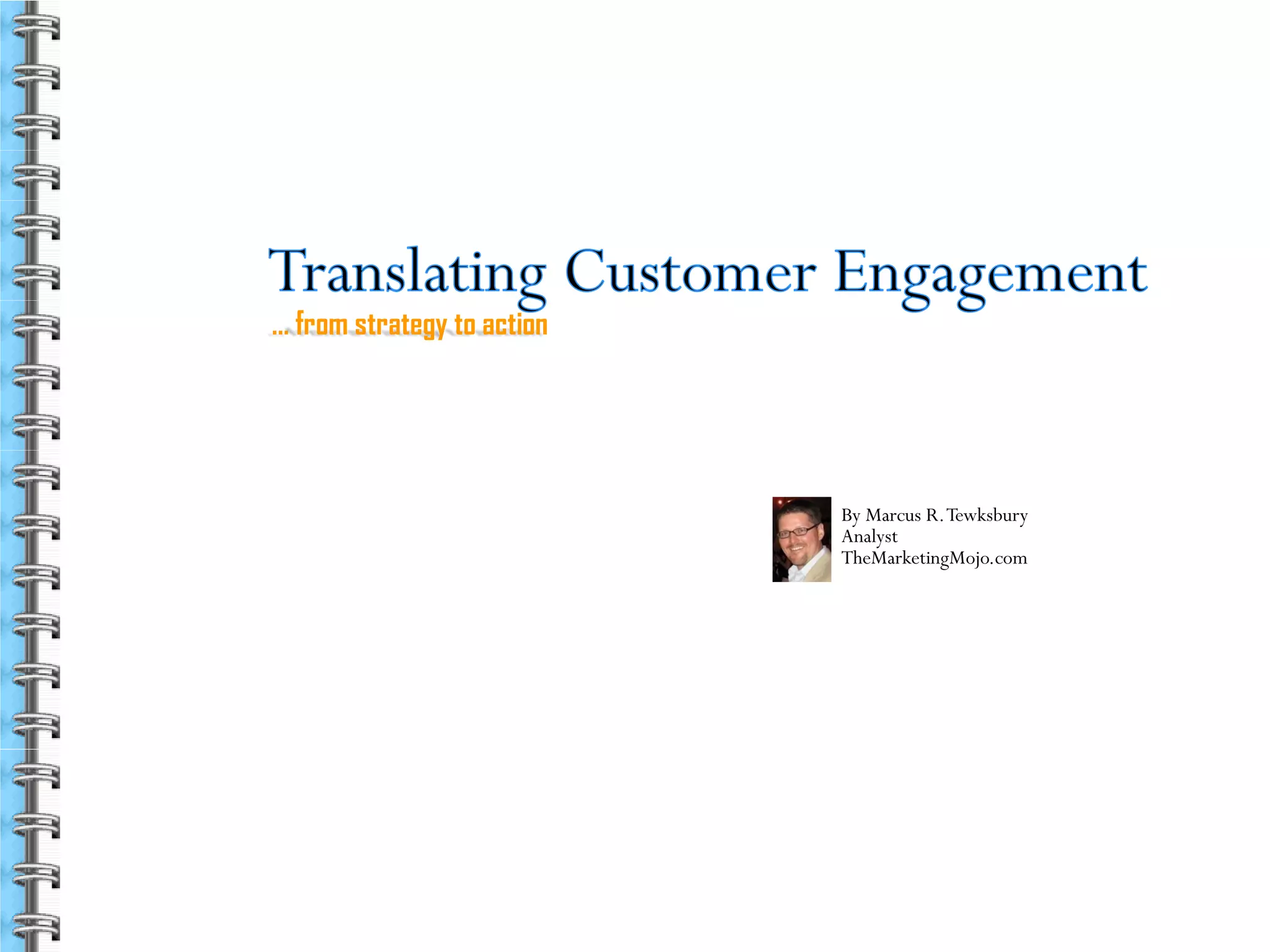 This document discusses translating customer engagement strategies into actionable campaigns. It begins by introducing Customer Engagement Marketing (CEM) as an approach for employing strategic engagement practices and translating them into measurable campaigns. It then presents a customer engagement cycle and framework for understanding how customers progress through different stages. It discusses developing strategies to mature relationships through the different stages. Finally, it provides guidance on how to operationalize the engagement cycle by developing nurturing campaigns, including choosing an audience, theme, envisioning outcomes, and laying out a plan.