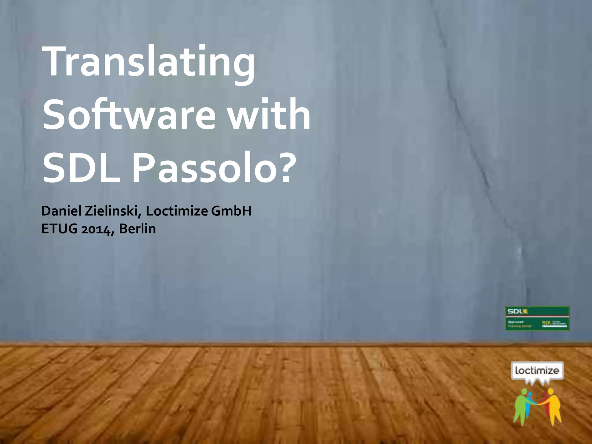 The document discusses differences between software localization and documentation translation, and why SDL Passolo is better suited than SDL Trados Studio for software localization. It notes that documents are self-contained, sentence-based, and use surrounding context, while software uses non-self-contained string IDs as context. It also explains that developers and workflows differ between the two. The document then outlines SDL Passolo's features for internationalization, localization project management, and integration with development workflows and quality assurance. It positions SDL Passolo and SDL Trados Studio as distinct but complementary solutions.