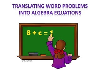 This presentation shows how to translate word problems into Algebra Equations. Keywords for doing translations are provided, as well as example questions.
