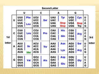 2. There are 64 possible codons made up of combinations of the 4 bases in mRNA, with 3 codons serving as stop signals. tRNA contains anticodons that pair with mRNA codons and carry the corresponding amino acid.