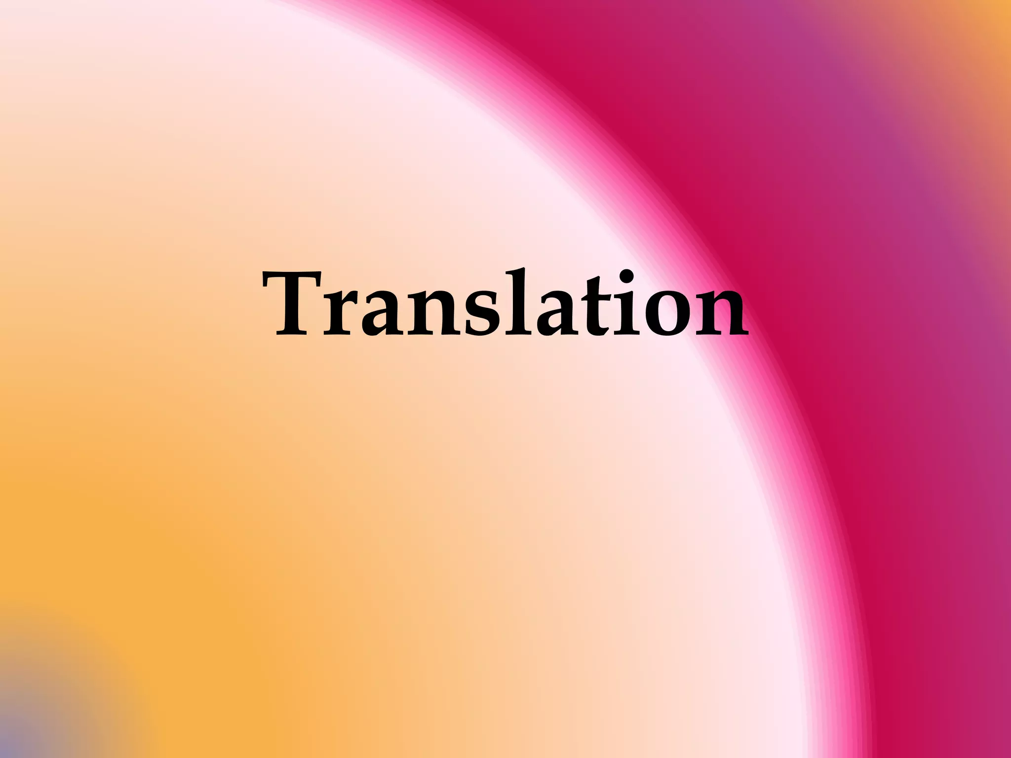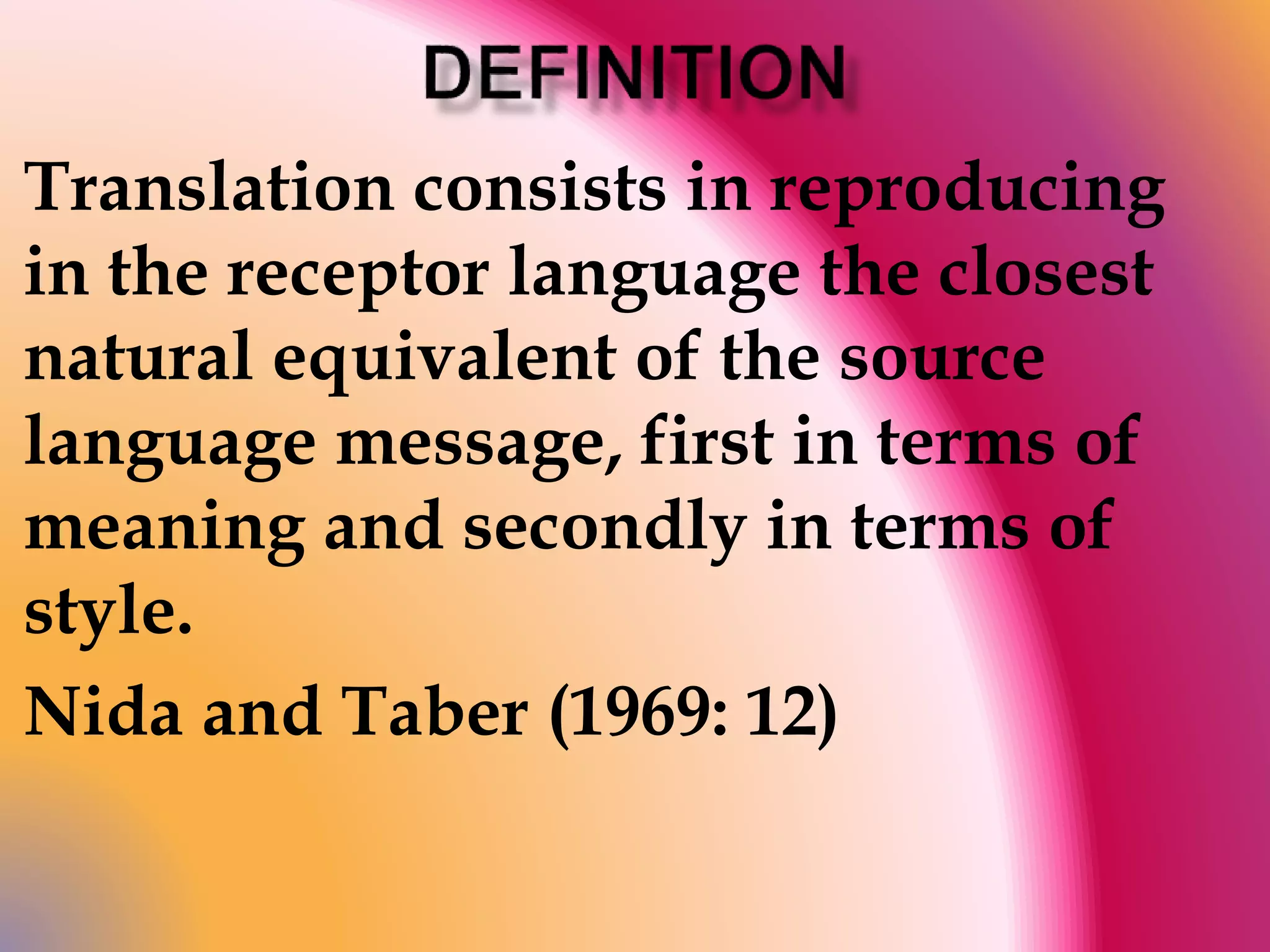 Translation involves reproducing the meaning and style of a source language text in the target language. There are three main types of translation: intralingual (rewording within the same language), interlingual (translating between languages), and intersemiotic (translating between verbal and nonverbal sign systems). Written translation allows revising and correcting the target text, while oral translation is done simultaneously or consecutively with limited time and inability to revise. Simultaneous interpretation involves translating the source speech simultaneously as it is uttered, while consecutive interpretation involves translating after segments of the source speech.