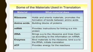The document discusses the process of protein synthesis through translation, where mRNA information is converted into an amino acid sequence with the help of tRNAs and ribosomes. It outlines the stages of translation, the required components, and the differences between prokaryotic and eukaryotic translation processes. Key differences include ribosome sizes, locations of the process, and stability of the translation machinery.
