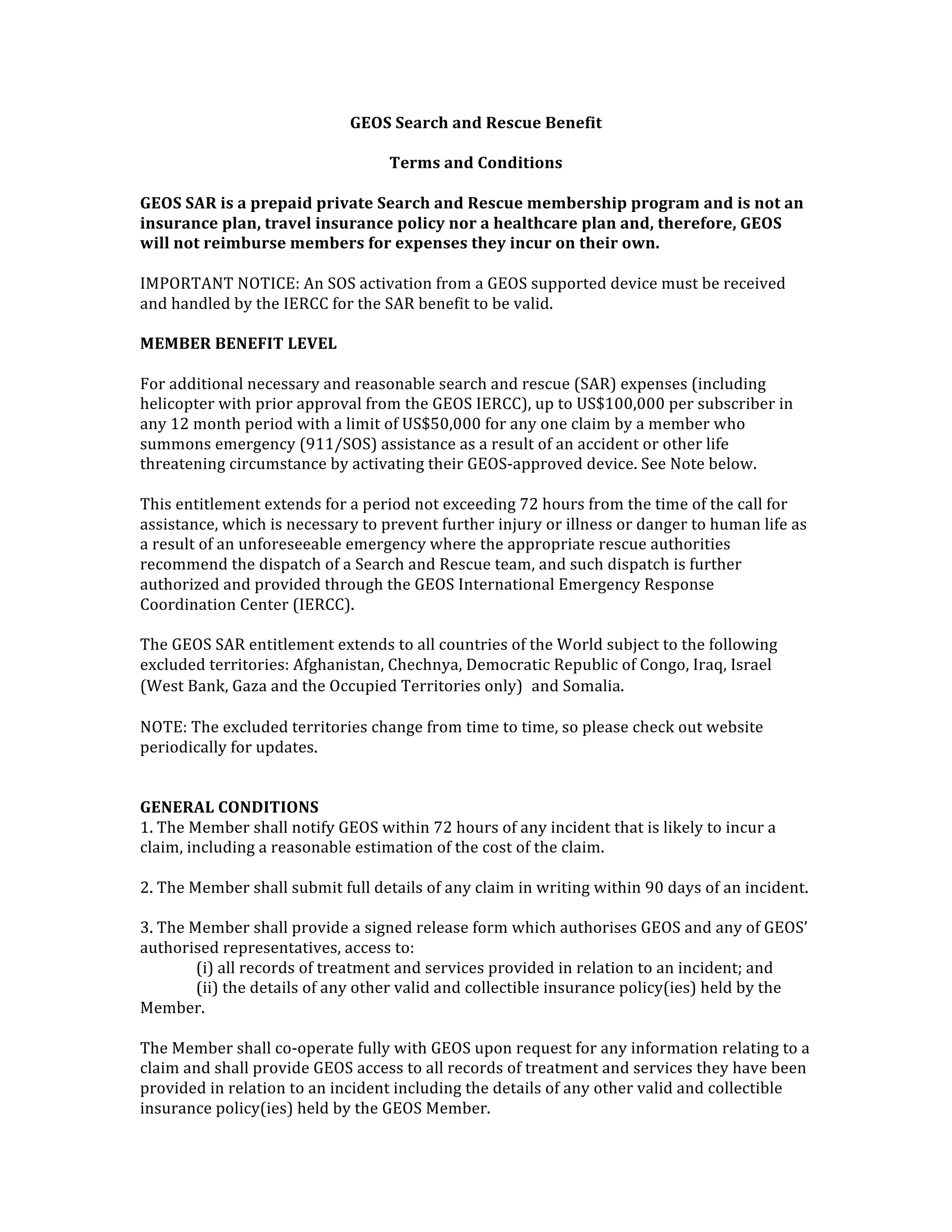 This document outlines the terms and conditions of the GEOS Search and Rescue membership program. It provides search and rescue benefits of up to $100,000 per subscriber per year, with a maximum of $50,000 per claim. The membership covers necessary SAR expenses for 72 hours from activating a distress signal via an approved GEOS device due to an accident or emergency. However, it excludes claims arising from travel against medical advice or to restricted areas, criminal acts, civil unrest, natural disasters, pre-existing illnesses, or recommended medical procedures.