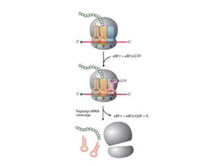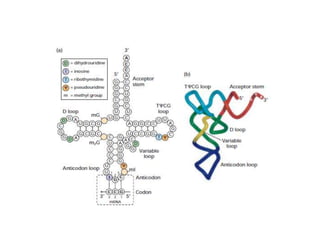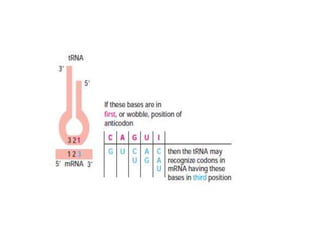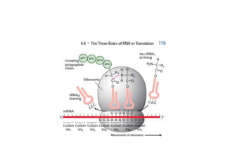 Messenger RNA carries genetic information from DNA in the form of codons that specify amino acids. Transfer RNA matches codons to their corresponding amino acids through complementary base pairing between its anticodon and the mRNA codon. Ribosomes catalyze the formation of peptide bonds between amino acids specified by mRNA and delivered by tRNA to assemble polypeptide chains according to the genetic code.