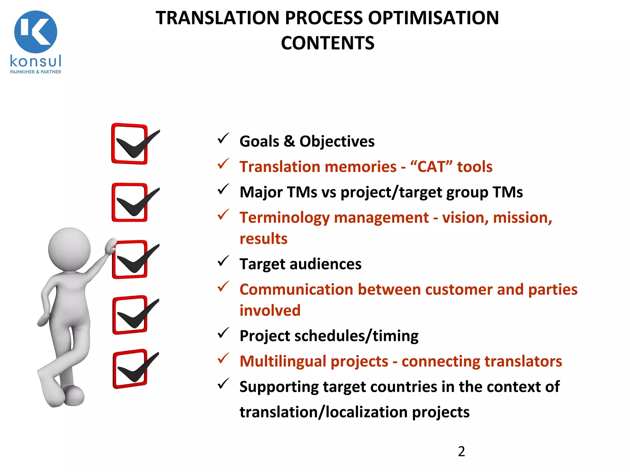 The document outlines a comprehensive approach to optimizing translation and localization processes, emphasizing the importance of solid procedures, high-quality translations, and effective communication among all parties involved. It details the roles of translation memories, terminology management, and project scheduling in enhancing translation efficiency and consistency. Additionally, it highlights the need for collaboration with target countries to ensure successful implementation and adaptation of translations.