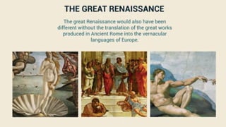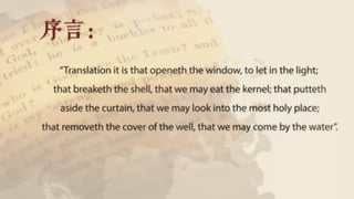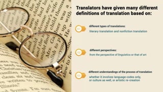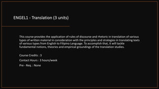 This course provides an application of translation rules and strategies for translating various written materials from English to Filipino. It covers fundamental translation theories and processes. The course is worth 3 credits and meets for 3 hours per week. There are no prerequisites. Grading is based on individual outputs, group outputs, and a term project or major exam. The course modules will cover introductions to translation, the translation process, understanding word meaning, and techniques for sentence translation.