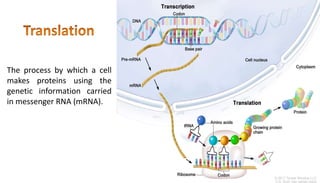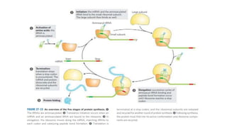 The document discusses the complex process of protein synthesis in cells, emphasizing the key roles of mRNA, ribosomes, and tRNAs in the translation of genetic information into proteins. It outlines the stages of protein biosynthesis, including activation of amino acids, initiation, elongation, termination, and post-translational processing, while also detailing significant components like ribosomal structures and aminoacyl-tRNA synthetases. The document highlights the fidelity mechanisms essential for accurate protein synthesis, including proofreading functions of synthetases and codon recognition processes.