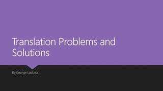 This document discusses various translation problems and potential solutions. It addresses issues such as changing titles to be more commercially viable in other cultures, replacing words that have different meanings, maintaining an author's stylistic choices, translating regional dialects and colloquialisms, dealing with vulgar or offensive language, translating humor that may not translate, explaining culture-specific references, quoting other works, translating less common languages, finding compromises for works being published across cultures, and balancing faithfulness to the original work with adaptions for other audiences. The overall message is that translation requires creativity, cultural knowledge, and discussion between the translator and author/publisher to solve challenges in a way that best conveys the original work.