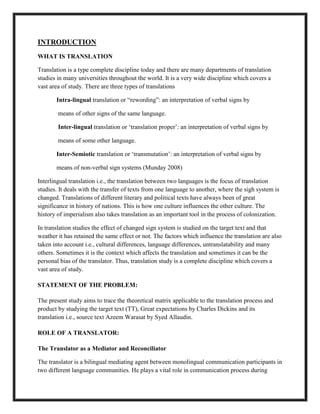 The document provides an analysis of the translation of Charles Dickens' novel Great Expectations into Urdu. It begins with an introduction on translation studies and theories of translation. The objectives are then stated as tracing the theoretical framework applied in the translation process. Key research questions focus on identifying the theoretical model used and its application/findings. The literature review outlines theories that will be applied, including Nida's theory of equivalence, Vinay and Darbelnet's translation techniques model, and Catford's linguistic shift approach. The analysis section applies these theories to examine examples from both the source and target texts. Elements like gender, aspect, and semantic fields are compared between the English and Urdu texts based on the outlined translation theories.