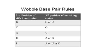 This document summarizes the process of protein synthesis through translation. It discusses how mRNA is transcribed from DNA and carries genetic codes to ribosomes. Ribosomes then translate mRNA into a polypeptide chain using transfer RNA (tRNA) and amino acids. The three phases of translation - initiation, elongation, and termination - are described in which mRNA codons are read and amino acids are linked together to form a protein.
