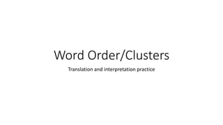 This document discusses word order and clusters in translation and interpretation. It emphasizes that the meaning, not the individual words or sentences, should be the focus when translating. There are two important types of clusters: noun + adjective clusters, which may have different word orders in different languages, and verb + object clusters, where some verbs only work with certain objects. Identifying these meaningful clusters can help interpreters translate more efficiently. Exercises are provided to help develop these skills.