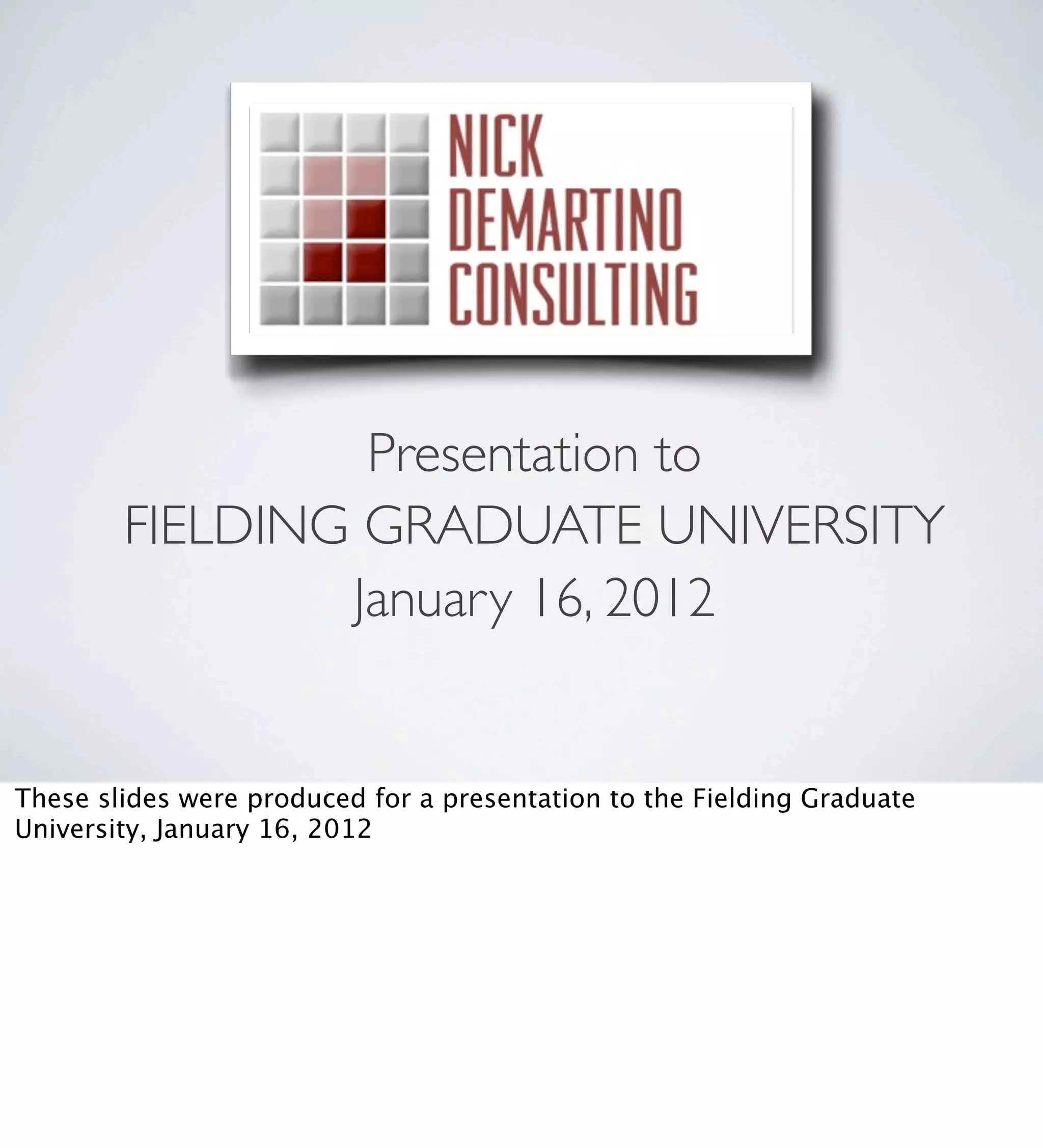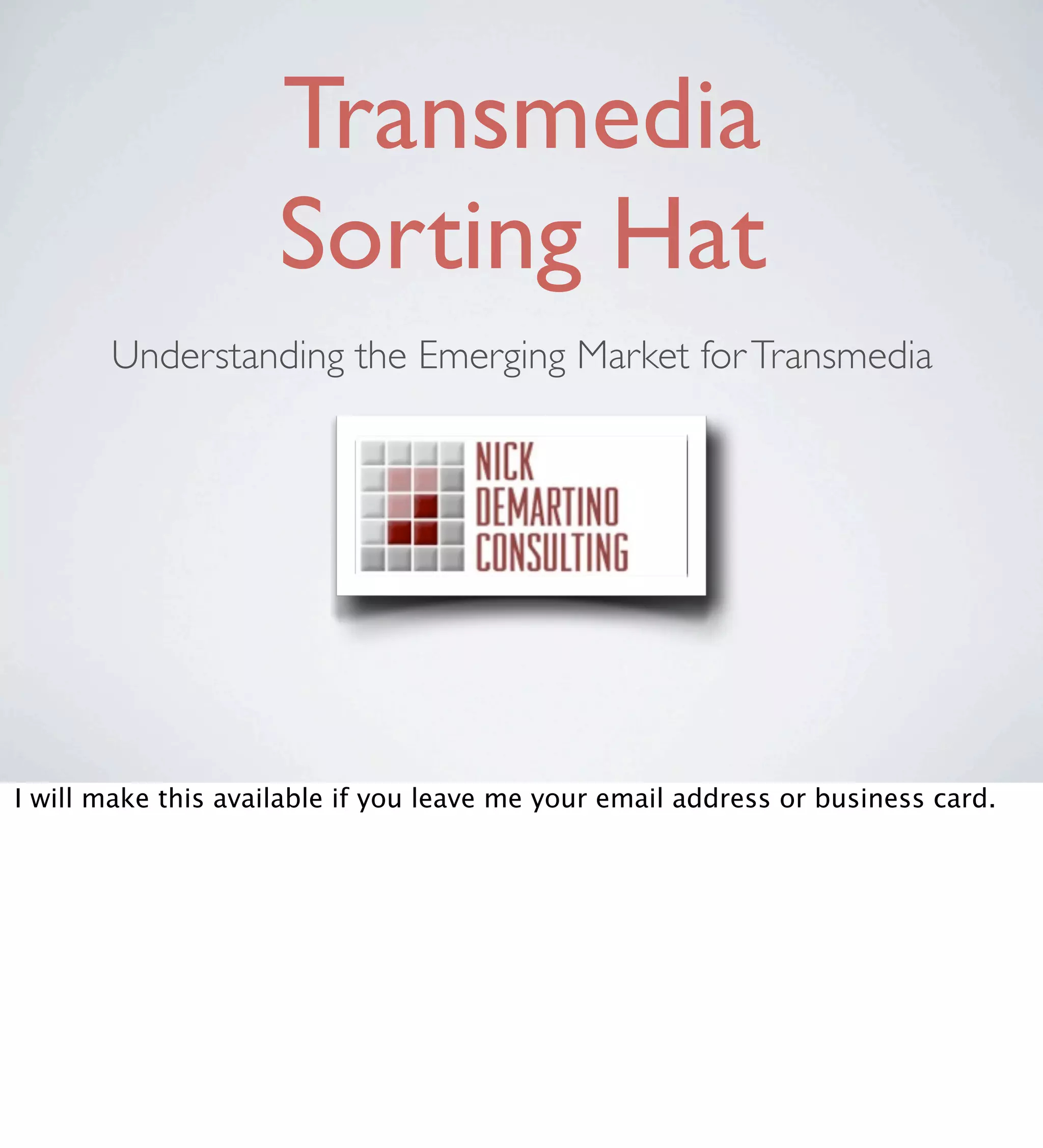 The presentation by Nick DeMartino on transmedia storytelling explores its definitions, history, and implications in media. Drawing from his experiences at the American Film Institute and recent consulting work, DeMartino highlights the collaborative nature and audience engagement techniques of transmedia, distinguishing it from traditional media adaptations. It emphasizes that transmedia storytelling involves creating cohesive narratives across multiple platforms, making the experience richer and more immersive for audiences.