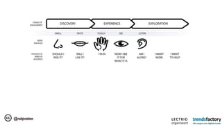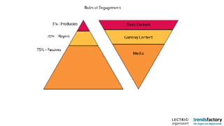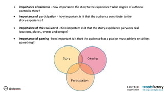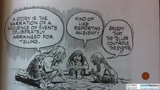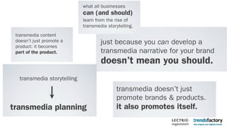 The document discusses the significance of storytelling in marketing, emphasizing the role of technology in how narratives are shared across different media. It outlines strategies for engaging with digital natives, leveraging social media, and creating interactive narratives to connect with audiences. Key recommendations include collaborating with tech companies, building community around content, and ensuring innovation within production teams.