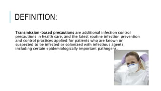 This document defines and describes transmission-based precautions, including contact, droplet, and airborne precautions. Contact precautions are used for pathogens spread by direct or indirect contact and aim to contain them. Droplet precautions are for diseases transmitted through respiratory droplets within 3-6 feet and include masking healthcare workers. Airborne precautions, the most stringent, are for pathogens that transmit through airborne particles like tuberculosis, and involve airborne isolation rooms, respirators, and waiting at least an hour before cleaning.
