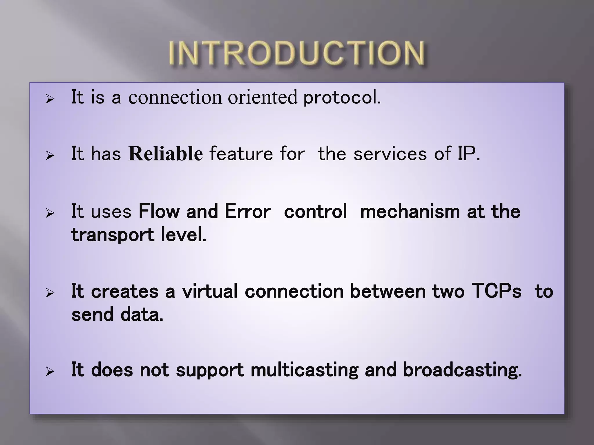 The document outlines the Transmission Control Protocol (TCP) as a connection-oriented protocol that ensures reliable data transmission using flow and error control mechanisms. It emphasizes TCP's features such as stream delivery, the use of acknowledgment for data integrity, and the three-way handshake process for establishing connections. Additionally, it compares TCP with User Datagram Protocol (UDP), highlighting TCP's reliability and full-duplex communication capabilities.