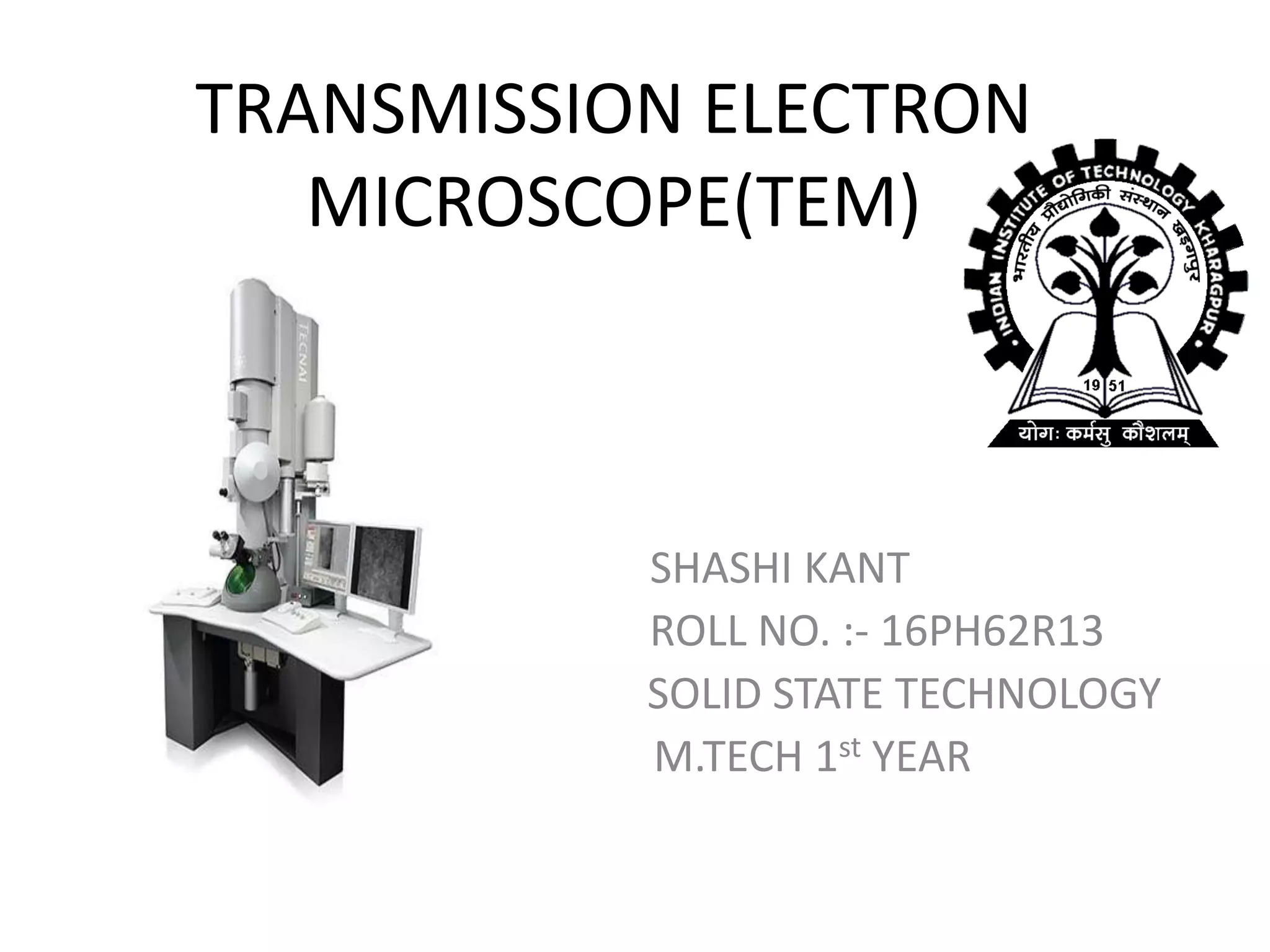 This document discusses the transmission electron microscope (TEM). It begins by comparing light microscopes and electron microscopes. It then describes the key components of a TEM, including the electron source, lenses, vacuum chamber, and screen. It explains that TEMs produce high-resolution black and white images through the interaction of electrons with prepared samples. Applications of TEM include studying crystals, metals, and semiconductor analysis. Advantages are high-quality images and structure information, while disadvantages include large size, expense, specialized training and sample preparation.