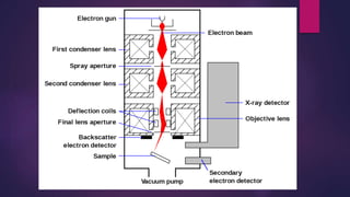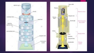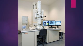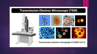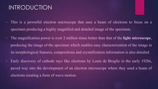 The document discusses the transmission electron microscope (TEM). It begins by explaining that a TEM uses a beam of electrons rather than light to produce highly magnified images of thin specimens. It then provides details on the history and development of the TEM. The body of the document describes the main components of a TEM, including the electron gun, image producing system, and image recording system. It explains how each component works and its role in producing a magnified image. Applications of the TEM in fields like biology and nanotechnology are also mentioned.