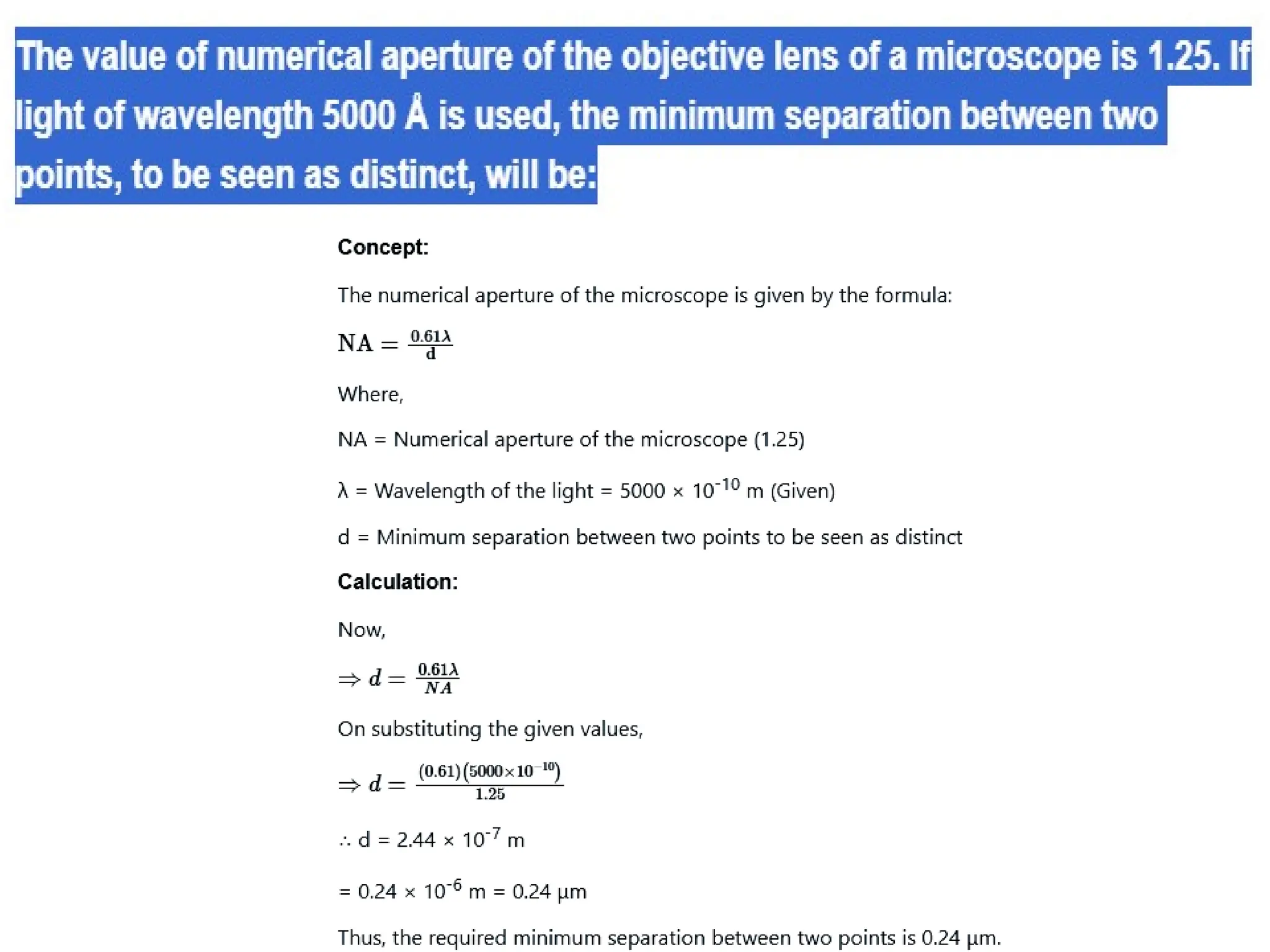 viewed in light with a wavelength of 555 nm. a) what is the resolution in a) metres b)