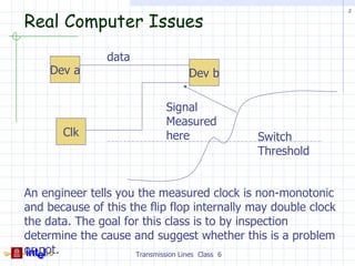 This document discusses transmission line basics and provides an overview of key concepts. It introduces transmission line equivalent circuits and relevant equations. The document outlines the agenda, which includes discussing the transmission line concept, equivalent circuits, reflection diagrams, loading, termination methods, propagation delay, and simple return paths. It also discusses two viewpoints of transmission lines - steady state in the frequency domain and transient in the time domain.