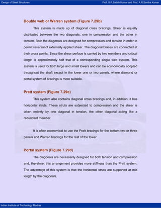 This document discusses the design of steel tower structures. It begins by outlining the process of analyzing member forces and sizing members based on their axial loads. It then describes various bracing systems used for towers, including single web, double web (Warren), Pratt, and portal systems. Factors affecting the design of compression members like effective length, slenderness ratio, and buckling are also summarized. Empirical formulas for determining safe compressive stresses based on material properties and member geometry are presented.