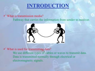 This document discusses different types of transmission media, including wired and wireless options. Wired transmission uses cables like twisted pair, coaxial, and optical fiber cables to transmit data through physical pathways in a bounded manner. Wireless transmission methods like radio waves, microwaves, infrared, Bluetooth, and satellites transmit data without cables by utilizing different frequencies. Each transmission media has advantages and limitations regarding speed, reliability, range, bandwidth, and susceptibility to interference.