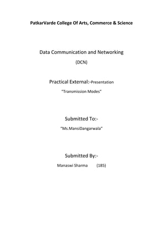 This document discusses different modes of data transmission including parallel transmission, serial transmission, asynchronous transmission, and synchronous transmission. Parallel transmission transmits all bits simultaneously but requires multiple wires, while serial transmission transmits bits one after the other on a single wire. Asynchronous transmission uses start and stop bits but does not require synchronization, while synchronous transmission transmits data in a continuous stream under a common clock and provides higher speeds without start/stop bits.