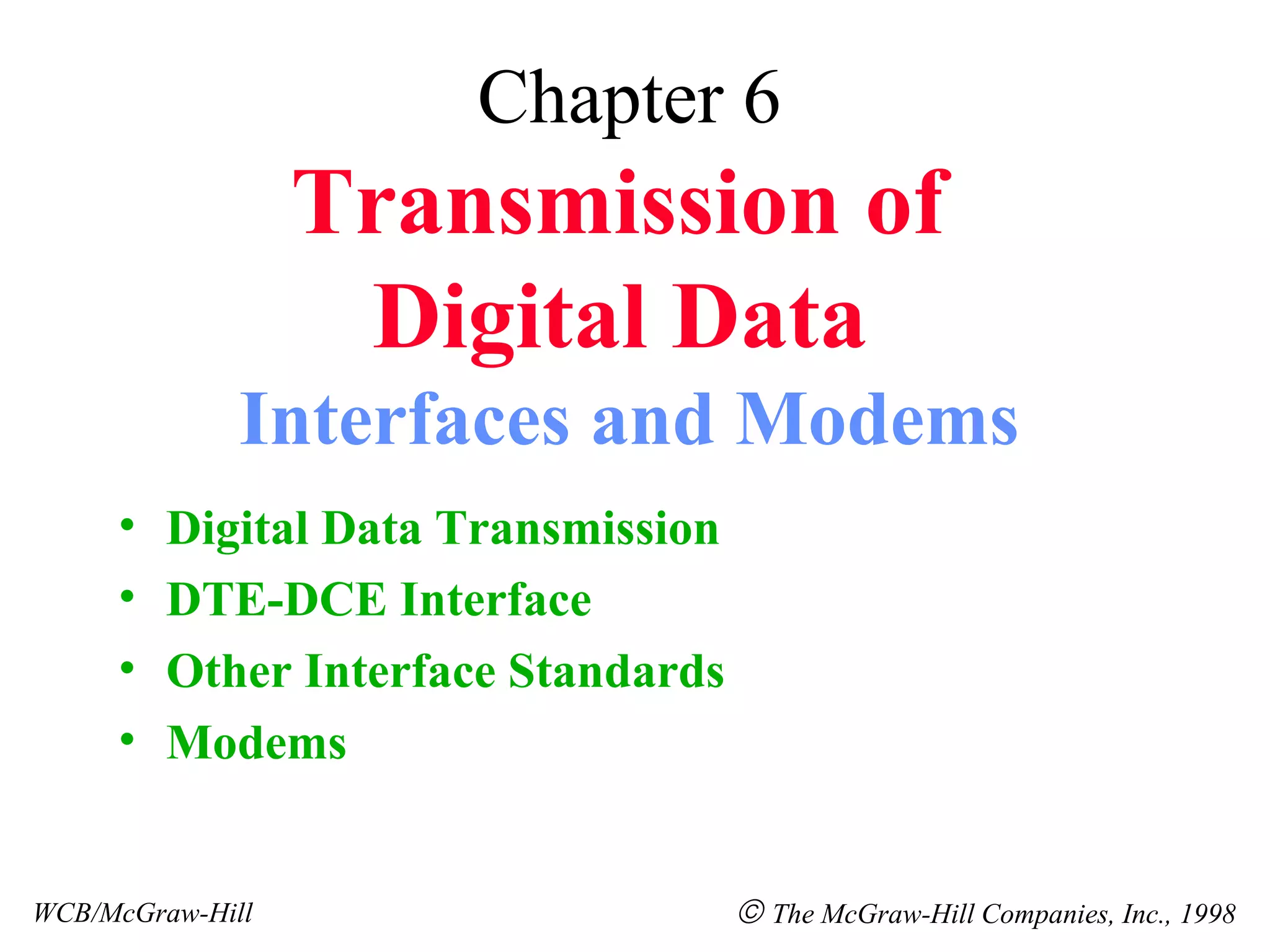 The document discusses digital data transmission and interfaces. It describes different transmission methods like parallel and serial transmission and synchronous and asynchronous transmission. It also discusses Data Terminal Equipment (DTE) and Data Circuit-terminating Equipment (DCE) interfaces, and interface standards like EIA-232. Modems are discussed as devices that convert digital signals from DTEs to analog signals for transmission and vice versa. Various figures illustrate these concepts.