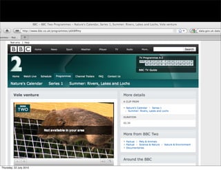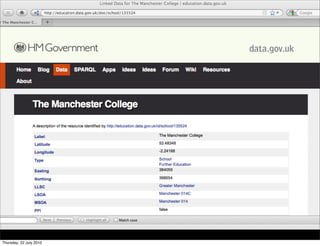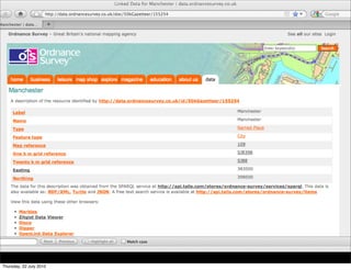 This document provides guidance on publishing linked data by describing how to (1) use URIs to identify things, (2) make those URIs accessible via HTTP, (3) provide useful information about those URIs using standards, and (4) include links between URIs. It recommends starting by describing important things and assigning them URIs, and then representing the descriptions in both human-readable and machine-readable formats like RDF. Publishers should also include links between related URIs and provide licensing information.