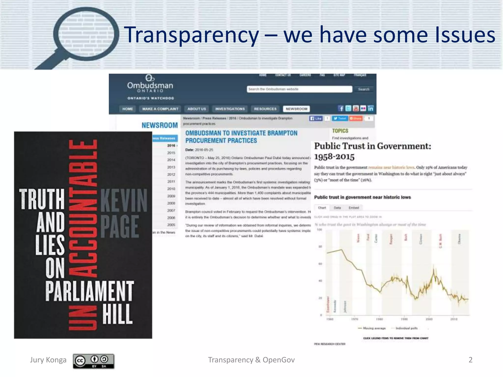 The document discusses open government and transparency. It notes that transparency is a core principle that supports accountability and participation, and is key to building trust. However, there is a conundrum between the transparency principle and its practical implementation. While openness creates political issues for elected officials, the document argues for less control and more empowerment through open data, open decisions, open budgets, open contracts, and open algorithms. Leadership is needed to fully implement open government and drive the necessary culture change towards more transparency.