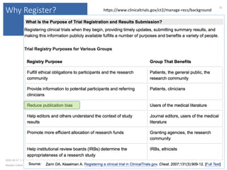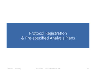 This document summarizes a lecture on protocol registration and pre-specified analysis plans. It discusses the history of clinical trial registration requirements, highlighting milestones like the establishment of ClinicalTrials.gov. It also reviews reasons for registration like ethical principles from the Belmont Report. Additionally, it covers types of registration platforms, issues with registration alone, debates around registering observational studies, and templates for developing pre-analysis plans. The key takeaways are that registration and pre-specifying analysis plans can help reduce bias, while allowing flexibility like registering changes to protocols.
