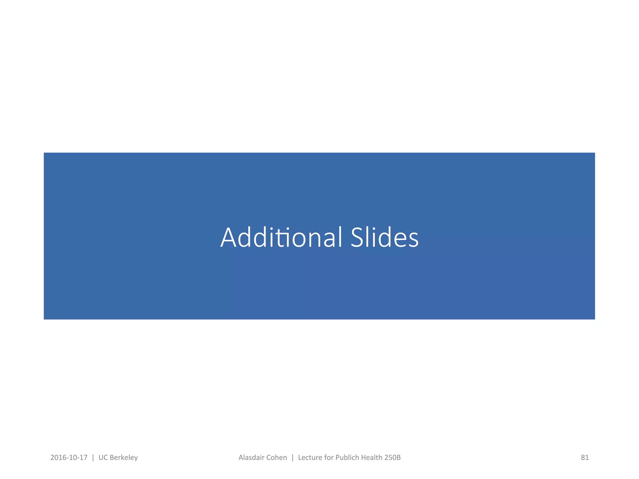 This document contains slides from a lecture on public health given by Alasdair Cohen at UC Berkeley on October 17, 2016. The slides discuss various topics related to research quality including publication bias, p-hacking, negligent science, Cochrane reviews, transparent reporting, and the CONSORT checklist. The CONSORT checklist is explained in detail over several slides, outlining the key elements that should be reported in randomized controlled trials to improve transparency and replication.