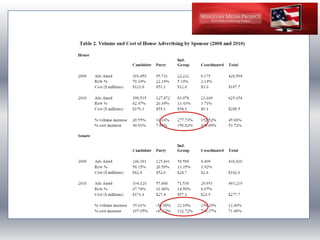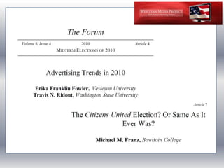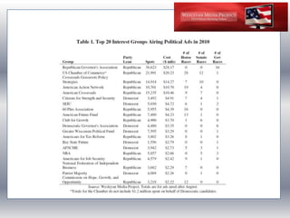 The document discusses the extensive ad frequency data related to political campaigns, indicating that over 5,000 ads have been coded with nearly 3 million airings and a total expenditure of $956 million. It highlights funding from interest groups, with $110 million in federal and $70 million in gubernatorial races. Additionally, it notes a shift towards more negative campaign tones among parties and interest groups, suggesting implications for future elections.