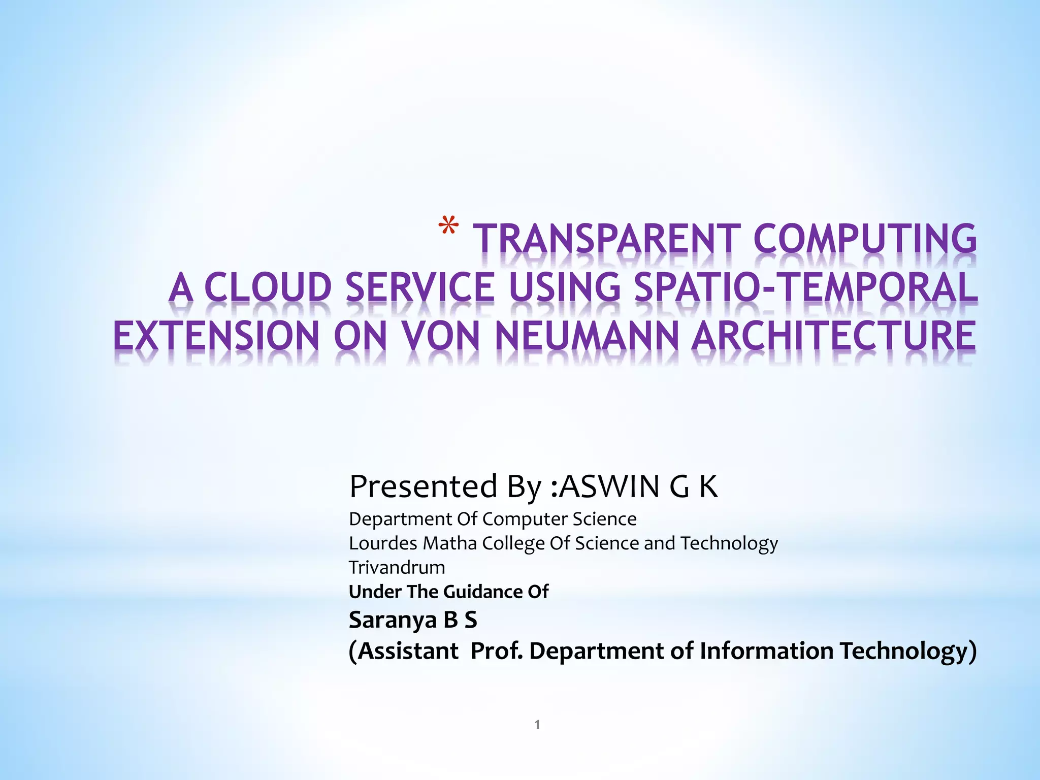 The document discusses a novel cloud service named transparent computing, which enhances the traditional von Neumann architecture by enabling spatio-temporal data storage and program streaming. It outlines the key components of cloud computing, including infrastructure, platforms, and software services, and presents a new model where programs are hosted on central servers and streamed to client devices. This approach reduces hardware costs, enhances personalization, and simplifies maintenance by separating computing from storage.