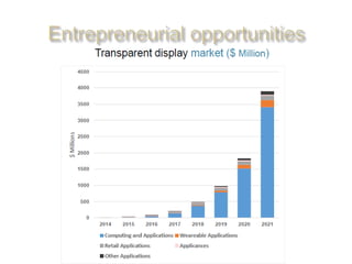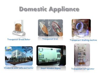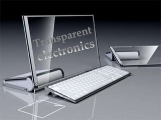The document discusses emerging transparent electronics technology that uses wide band-gap semiconductors and materials such as graphene for various applications, including batteries, USB drives, and transparent circuits. It highlights the advantages of non-toxic and cheap materials, high performance, and aesthetic appeal. Additionally, it covers methods for producing aligned carbon nanotubes and the potential market and recycling implications for these technologies.