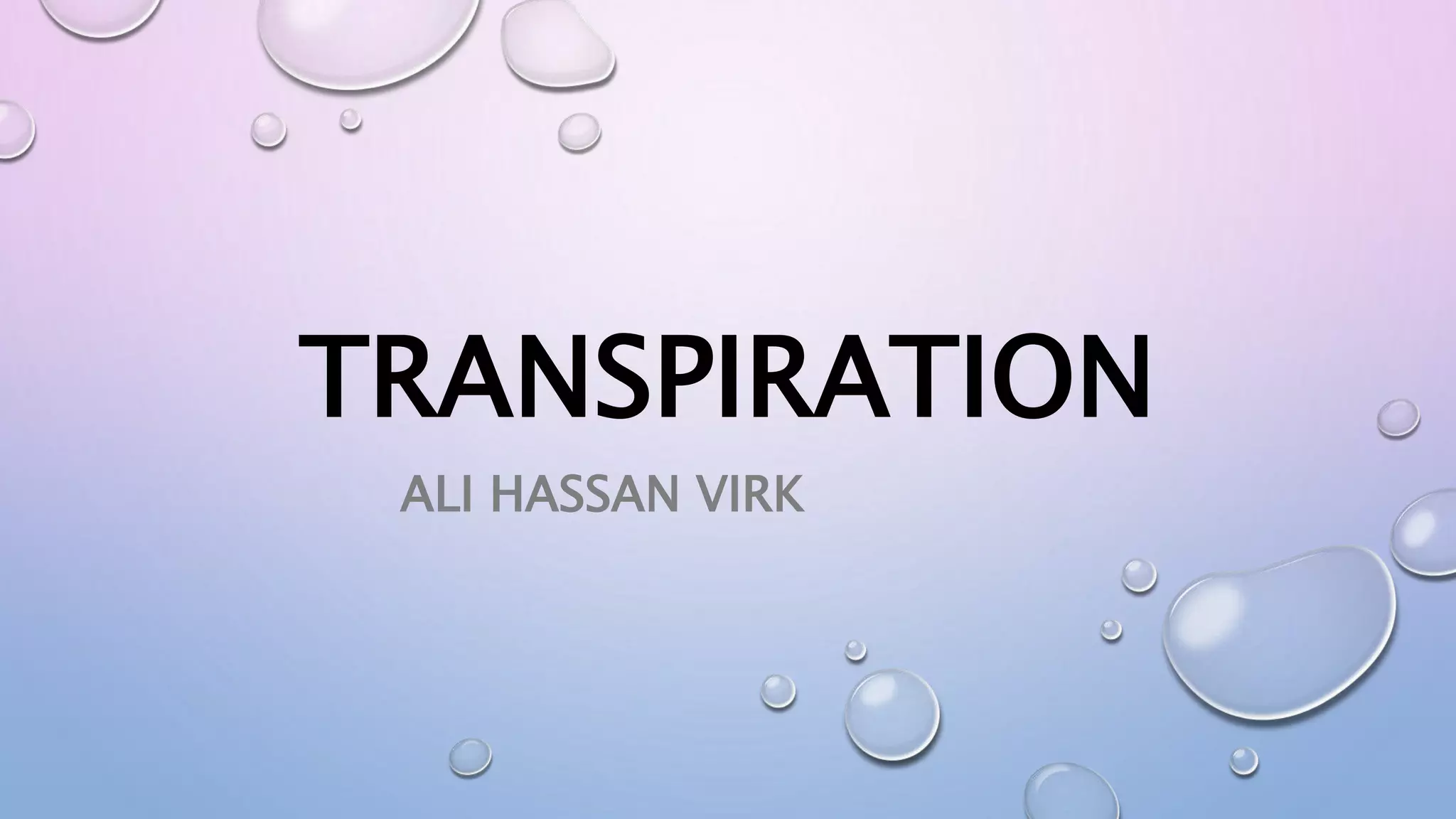 Transpiration is the process by which plants absorb water through their roots and release water vapor through pores in their leaves. It serves two main functions: cooling the plant and pumping water and minerals to the leaves for photosynthesis. The majority (80-90%) of water loss from plants occurs through stomatal transpiration, which takes place through specialized pores called stomata located mostly on the undersides of leaves. Transpiration is important as it creates suction that draws water up from the roots and cools the plant through evaporative cooling.