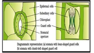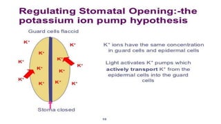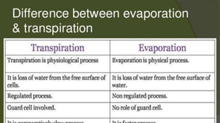 Transpiration is the evaporation of water from plant surfaces, mainly leaves, through stomata. It occurs through three main processes: stomatal transpiration via openings in the leaves called stomata, cuticular transpiration through the plant cuticle, and lenticular transpiration through openings called lenticels. Stomata are regulated by guard cells which open and close to control transpiration rates in response to various environmental factors like light, temperature, humidity and water availability. Higher temperatures, light levels, low humidity and adequate water supply generally increase transpiration, while the reverse decreases it.