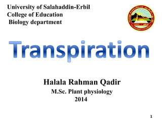 This document is an outline for a presentation on transpiration in plants. It defines transpiration as the movement of water through a plant and evaporation from aerial parts, especially leaves. It describes the three main types of transpiration as cuticular, lenticular, and stomatal transpiration. It explains that transpiration allows for diffusion of carbon dioxide for photosynthesis, cools the plant, and enables absorption of minerals and water from the roots to shoots. The outline concludes by noting the next lab will cover mineral nutrition in plants.