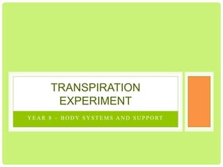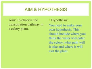 This document provides instructions for an experiment to observe the transpiration pathway in a celery plant. The aim is to see how water enters the plant, the path it takes, and where it exits. Equipment includes celery, food coloring, water, a microscope, and slides. The method has students place celery in colored water, then examine slices under a microscope. They will observe the water moving up the plant and escaping through leaves.