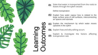 3) The rate of transpiration is affected by environmental factors like light, temperature, and humidity, with higher light, temperature, and lower humidity increasing the rate.