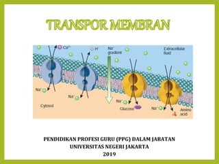 Transpor membran terjadi melalui tiga mekanisme utama, yaitu transpor pasif, transpor aktif, dan transpor vesikel. Transpor pasif terdiri atas difusi, osmosis, dan difusi terfasilitasi yang melibatkan pergerakan molekul menuruni gradien konsentrasi. Transpor aktif memerlukan energi karena melawan gradien konsentrasi dan terbagi atas transpor aktif primer dan sekunder. Transpor vesikel meliputi endositosis dan eksositosis yang memasuk