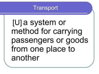 This document provides information about various modes of transport and roads in Britain. It discusses different types of vehicles including cars, buses, trains, boats, planes and more. It also describes different types of roads in Britain such as motorways, A-roads and B-roads. Additionally, it covers topics like traffic signs, the Highway Code and minimum driving ages in Britain. The document serves as a guide to transportation systems and road rules in the United Kingdom.