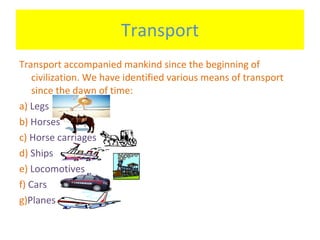 Transportation has evolved significantly since ancient times. Early humans relied on walking but then began using horses and horse-drawn carriages. Water transportation developed through sailing ships and steamboats. Rail transportation emerged through early trains powered by animals and steam engines. Cars were invented in the late 19th century, powered initially by gasoline engines. Airplanes were developed in the early 20th century through the Wright brothers' pioneering controlled flights. Modern transportation also includes motorbikes, trains, and spacecraft.