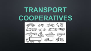 Transport cooperatives provide transportation services to members at lower rates. They exist at national, state, and local levels. Nationally, the National Federation of Tourism and Transport Cooperatives of India oversees over 625,000 cooperative societies. Transport Cooperation of India is a large integrated logistics cooperative. At the state level, cooperatives provide transportation in sectors like buses, taxis, and credit. Cooperatives have strengths like strong management but also weaknesses such as high staff turnover and weak online presence. Opportunities include new services and emerging markets, while threats include economic downturns and government regulation.